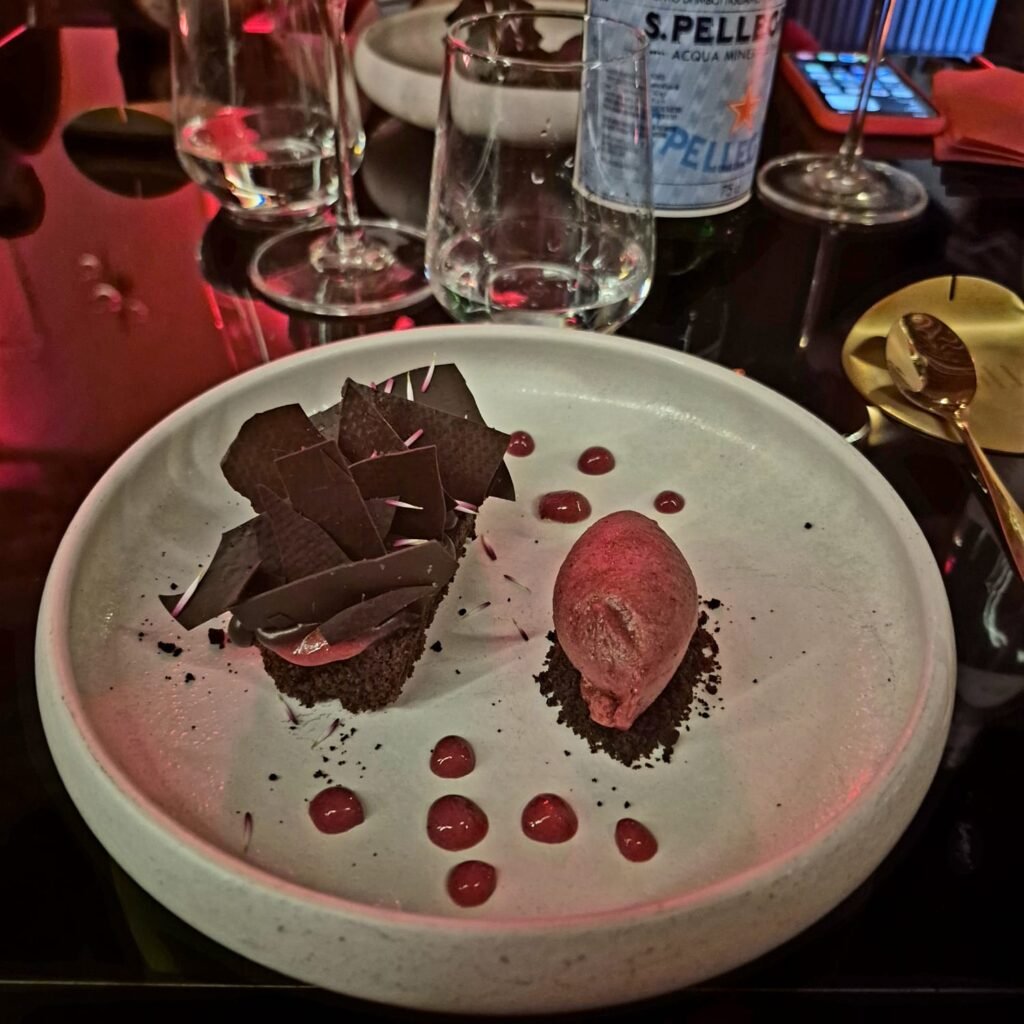 Il dolce è riuscito ed equilibrato, con contrasti ben dosati tra dolcezza, acidità e note speziate. Il sorbetto ai frutti rossi dona freschezza e alleggerisce il finale, chiudendo la cena in modo armonioso e piacevole.