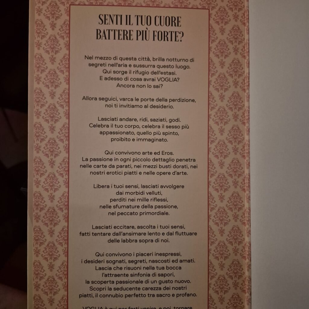 Il ristorante Voglia si è rivelato una esperienza diversa dal solito a Milano, capace di unire cucina curata, atmosfera suggestiva e un concept tematico originale. Al termine della cena, è possibile visitare la stanza tematica dedicata al concept del locale oppure fermarsi al bancone per un cocktail a tema, completando la serata in modo coerente con l’identità del ristorante.
