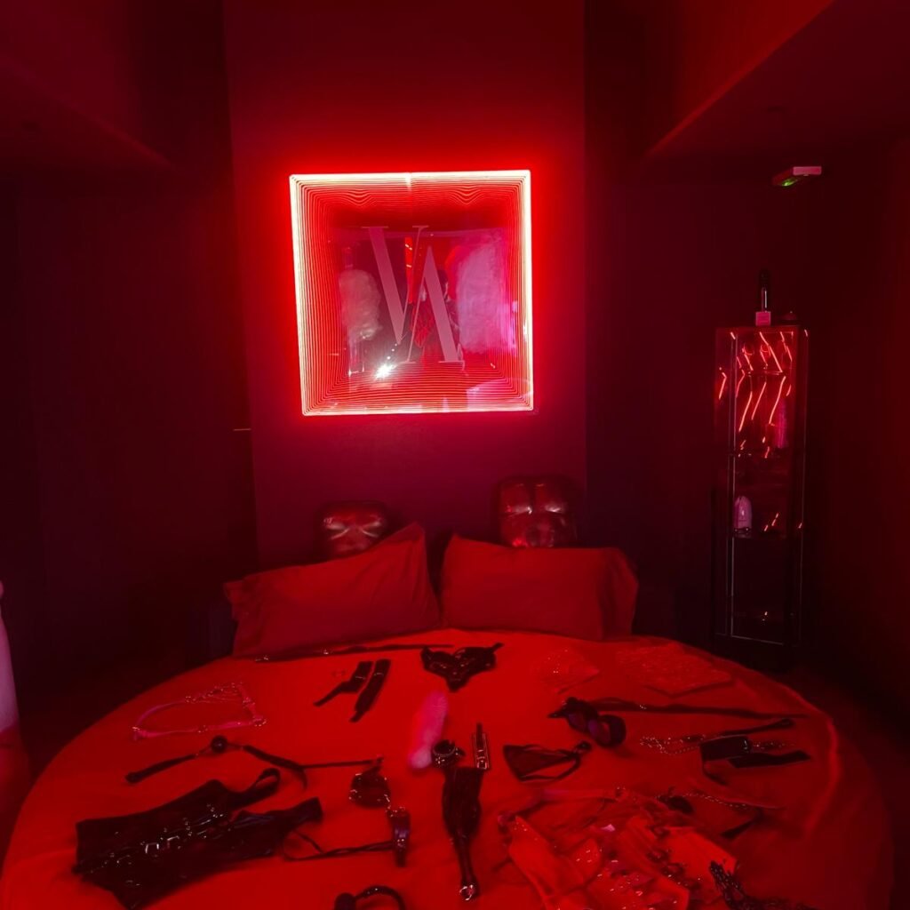La sala è caratterizzata da luci soffuse e tonalità rosse, elementi che creano un’atmosfera intima e suggestiva, perfettamente coerente con il concept del locale. L’ambiente è studiato per stimolare i sensi senza risultare eccessivo, mantenendo sempre un’eleganza raffinata.